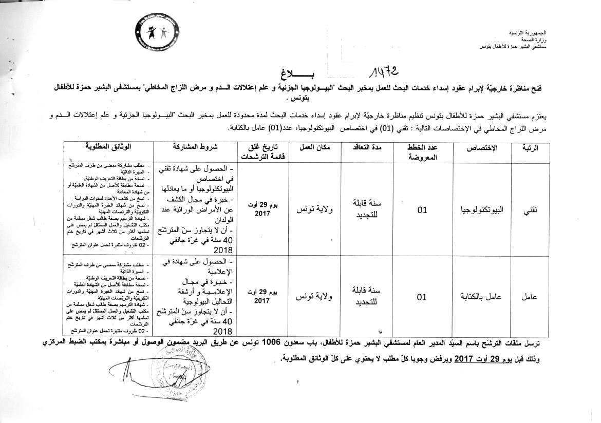 إعلان عن فتح مناظرة خارجية لإبرام عقود إسداء خدمات البحث لمدة محدودة :تقني اختصاص بيوتكنولوجية وعامل