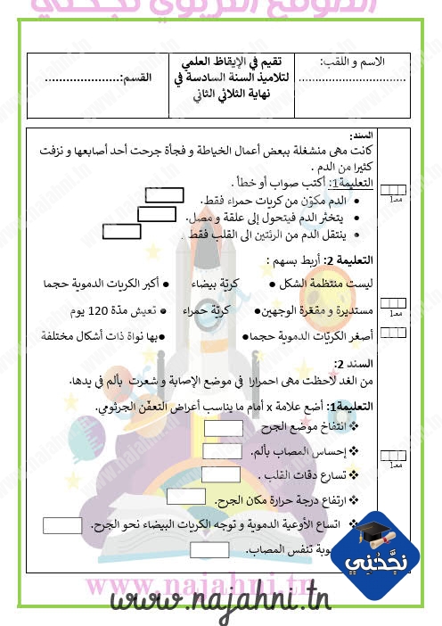 تقييم نهاية محور الدم والتعفن الجرثومي السنة السادسة الثلاثي الثالث.امتحان في الثلاثي الثالث. تقييم نهاية محور الدم والتعفن الجرثومي سنة سادسة. امتحان سداسي ثاني في الايقاظ العلمي