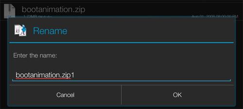 3. طويل اضغط على الملف، واختيار إعادة تسمية واسمها bootanimation.zip1 .
