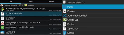 4. L تخصيص ملف الرسوم المتحركة التمهيد المخصصة (في هذه الحالة، ‘bootanimation.zip’). اضغط لفترة طويلة على ملف مضغوط ثم اختر تثبيت .