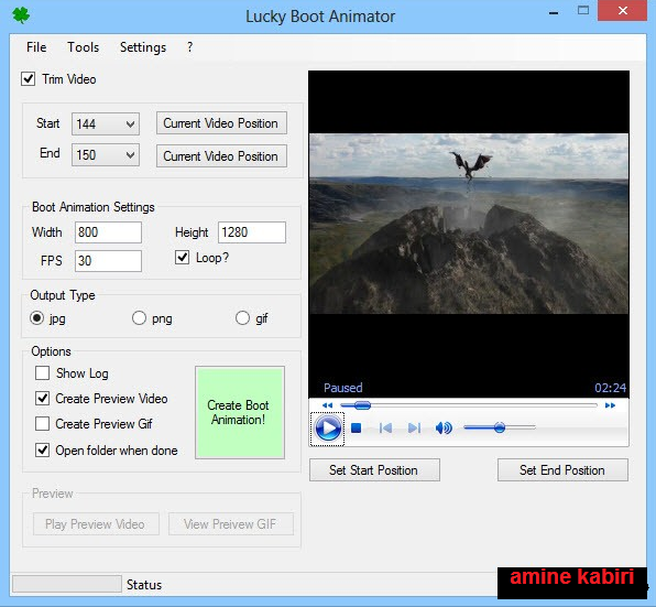 يمكنك اختيار مجلد الإخراج لملفات الرسوم المتحركة التمهيد من ميني بار – تحت “إعدادات” القائمة الفرعية. أخيرا عندما كنت راضيا عن الإعدادات، يمكنك النقر على إنشاء التمهيد الرسوم المتحركة! زر وسوف تبدأ عملية استخراج الإطارات ومن ثم تعبئتها في bootanimation.zip . يمكنك ثم نسخ هذا الملف وتطبيق الخطوات السابقة وذا لم تفهم طريقة استخدام برنامج boot animation lucky فيمكنك كتابة اسمه علي محرك البحث الخاص بيوتيوب وستحصل علي الاف الفيديوهات التي توضح الطريقة واخيرا مبروك عليك شاشة الإقلاع الجديدة والتي من صنعك انت